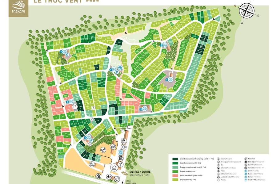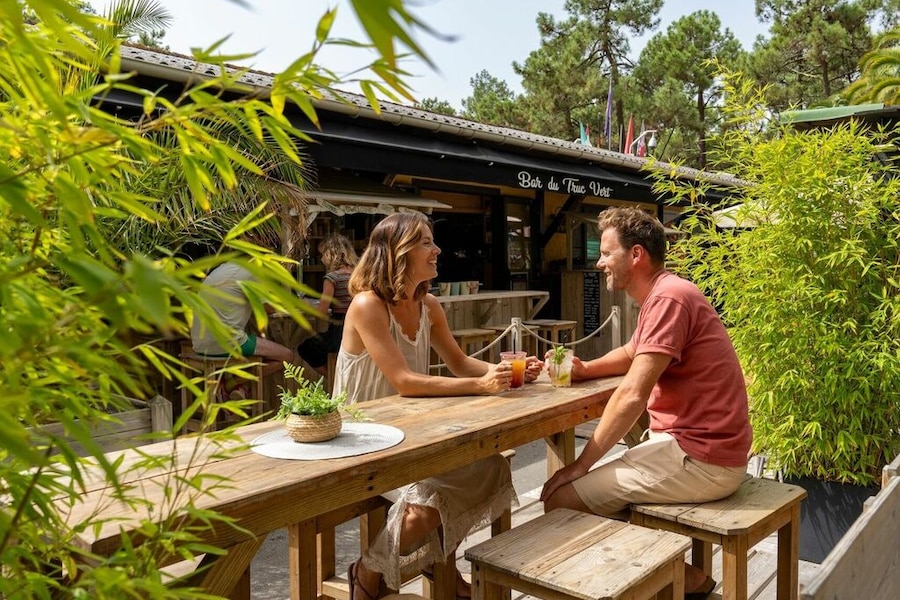 Camping Sandaya Le Truc Vert befindet sich in einem großen Pinienwald. Die Stellplätze sind von Bäumen und Hecken umgeben, was viel Schatten und Privatsphäre bietet. Ein Teil der Stellplätze ist nur über charmante Fußwege erreichbar – ideal für alle, die eine ruhige und naturnahe Umgebung schätzen. Der Campingplatz verfügt über sieben gut gepflegte Sanitäranlagen, von denen drei speziell für Menschen mit eingeschränkter Mobilität angepasst sind.Mehr als nur Strand und Natur