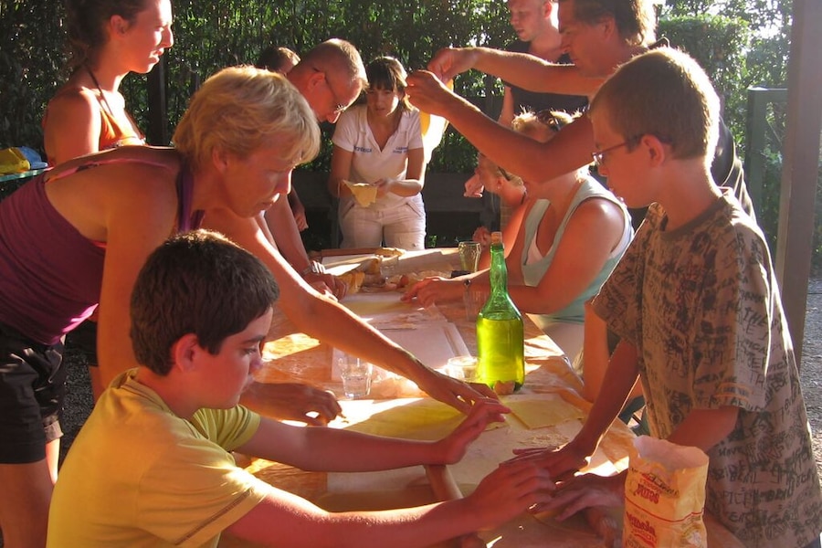 Badeanzug und Bikini gehören zuerst in den Koffer. Der Campingplatz Barco Reale hat drei Schwimmbäder. Von allen drei Pools aus haben Sie den atemberaubenden Blick auf die toskanischen Hügel. Die Kinder können sich in dem großen Planschbecken vergnügen. Sie können auch in dem größeren Becken mit einem Meter Tiefe sicher spielen. Der größte Pool liegt direkt daneben und ist ideal ein paar ruhige Bahnen zu ziehen. Natürlich auch, um die Aussicht zu genießen! Barco Reale ist auch ein sehr hundefreundlicher Campingplatz. Wie schön, wenn der Urlaub erst komplett ist, wenn der Hund dabei ist!Hausgemachte Spaghetti und toskanische Weine