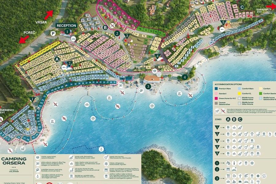 Aufwachen mit Blick aufs Meer und kleine Inseln direkt vor der Küste: genau das ist Camping Orsera. Dieser charmante Campingplatz liegt direkt an der Adria und nur einen kurzen Spaziergang vom künstlerischen Vrsar entfernt. Der perfekte Ort also für einen entspannten Strandurlaub – und zugleich ein idealer Ausgangspunkt, um Istrien zu entdecken!Kristallklares Meer